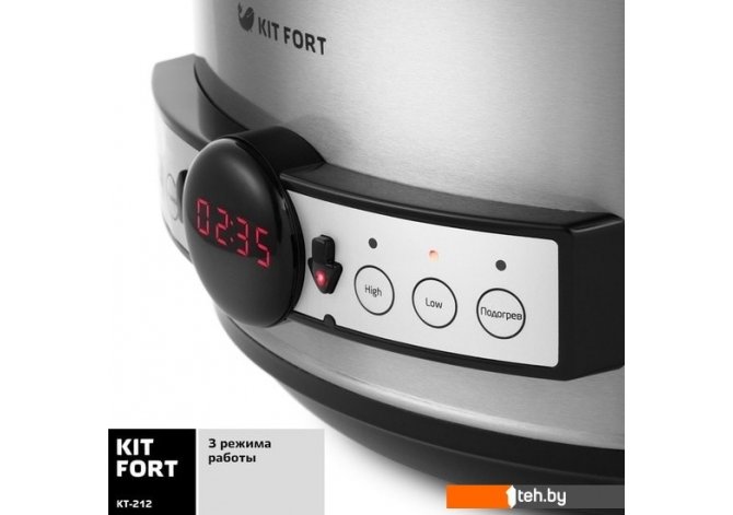 | Информация | Медленноварка Kitfort KT-212 — это простой в пользовании кухонный прибор с большим диапазоном применения. Она состоит из двойного корпуса, внутри которого по периметру расположены нагреватели, и керамической кастрюли с крышкой.Температура приготовления лежит в диапазоне 60–120 °С в зависимости от режима и особенностей готовящегося блюда. Благодаря такому температурному диапазону вода почти не испаряется, а продукты медленно тушатся в собственном соку, сохраняя практически все витамины и полезные микроэлементы. |