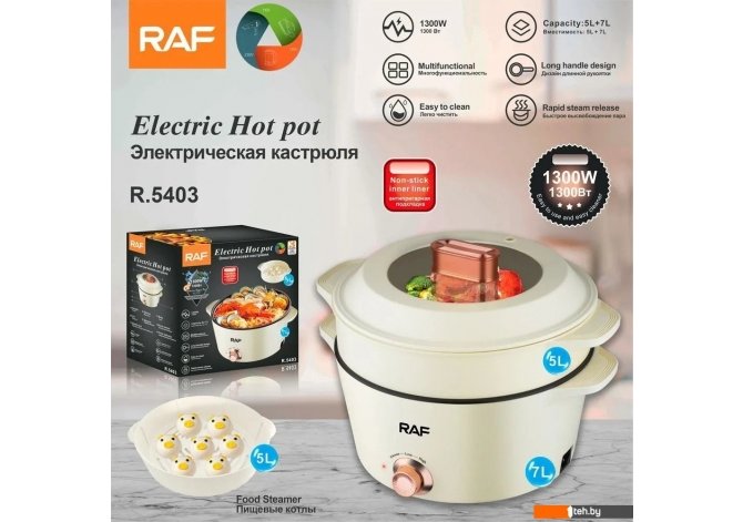 | Информация | ??Текст описания составлен при помощи искусственного интеллекта. - Управление электрокастрюлей RAF R.5403 осуществляется механическим способом, что делает её использование интуитивно понятным и удобным. Вы сможете легко настроить нужные параметры для приготовления ваших любимых блюд. - С мощностью 1 300 Вт, эта электрокастрюля обеспечивает быстрое и эффективное приготовление пищи. Вы сможете наслаждаться горячими и вкусными блюдами в кратчайшие сроки. - Объём чаши в 7 литров позволяет готовить большие порции, что идеально подходит для семейных ужинов или встреч с друзьями. А дополнительный объём в 5 литров даёт возможность готовить ещё больше! - Антипригарное покрытие чаши гарантирует, что ваши блюда не прилипнут, а процесс уборки станет лёгким и быстрым. Вы сможете сосредоточиться на приготовлении, а не на мытье посуды. - Благодаря функции пароварки, вы сможете готовить здоровую пищу на пару, сохраняя все витамины и полезные вещества. Это отличный способ разнообразить своё меню. - Обратите внимание, что извлечение чаши происходит без дополнительных приспособлений, что делает процесс ещё более удобным и безопасным. - Регулировка температуры во время приготовления позволяет вам контролировать процесс и добиваться идеального результата для каждого блюда. - Корпус из пластика делает электрокастрюлю лёгкой и удобной в использовании, а также обеспечивает надёжность и долговечность. |