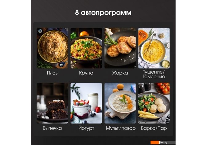 | Перечень режимов работы | Плов, Крупа, Жарка, Выпечка, Варка, Приготовление на пару, Йогурт, Тушение, Томление, Мультиповар |