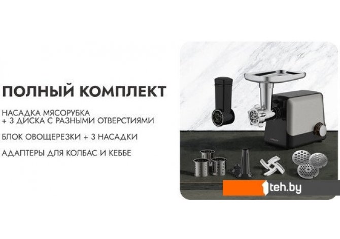 | Полная комплектация | мясорубка, диск/решетка для фарша (3 шт.), насадка для кеббе, насадка для домашней колбасы, насадка для шинковки, терка (3 шт.), загрузочный лоток, нож, толкатель, фиксирующая гайка, шнек |