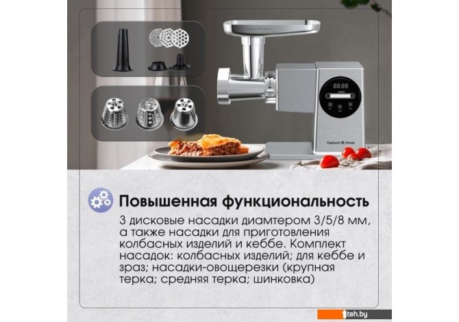 | Информация | - Электрическая мясорубка ZMG-055 от Zigmund & Shtain с набором насадок-овощерезок – это идеальный кухонный помощник, который значительно упростит работу любой хозяйки. Мощная и производительная модель позволяет быстро и качественно перерабатывать мясо, создавая вкусные домашние блюда: котлеты, пельмени, голубцы и многое другое. - В комплект входят: три дисковые насадки с отверстиями ? 3/5/8 мм для различной рубки, а также насадки для колбас и кеббе. Комплект насадок-овощерезок включает крупные и средние терки, а также шинковку, что расширяет функциональность мясорубки и превращает её в полноценный кухонный комбайн. С помощью этих насадок вы сможете быстро натереть или нашинковать любые овощи и фрукты, придавая вашим салатам и нарезкам аккуратный и эстетичный вид. - Мясорубка ZMG-055 обладает максимальной мощностью 2700 Вт и способна перерабатывать до 2,7 кг мяса в минуту. Специальная спиралевидная перфорация раструбов обеспечивает легкое движение мяса, предотвращая его застревание и гарантируя 100% выход продукта. Нож из нержавеющей стали с лазерной заточкой эффективно справляется с любым мясом. Металлическое соединение двигателя со шнеком обеспечивает прочность и устойчивость к нагрузкам. Надежный DC-двигатель с медной обмоткой и усиленный приводной механизм гарантируют долговечность работы мясорубки. - Мясорубка ZMG-055 оснащена функцией защиты двигателя от перегрузок: при наматывании жил на шнек устройство автоматически отключается. Функция реверса позволяет легко освободить шнек от жил, не разбирая прибор. Корпус из литого алюминия устойчив к влаге, пищевым кислотам и моющим средствам, имеет ровную поверхность и современный дизайн. - Уход за мясорубкой ZMG-055 прост: металлическая ручка блокировки облегчает сборку и разборку. Прорезиненные нескользящие ножки обеспечивают надежную фиксацию на поверхности, что гарантирует безопасность в процессе работы. Насадки удобно хранятся в специальной подставке с пылезащитной крышкой. - Конструктивные особенности включают отсек для хранения аксессуаров, увеличенный шнековый блок, металлическое соединение двигателя и шнека, а также спиралевидную перфорацию раструба. В комплект входят: мясорубка, три дисковые насадки, насадка для кеббе и зраз, насадка для колбас, комплект насадок-овощерезок, инструкция и гарантийный талон. Мясорубка ZMG-055 станет незаменимым помощником на вашей кухне. Готовьте быстро и с удовольствием! |