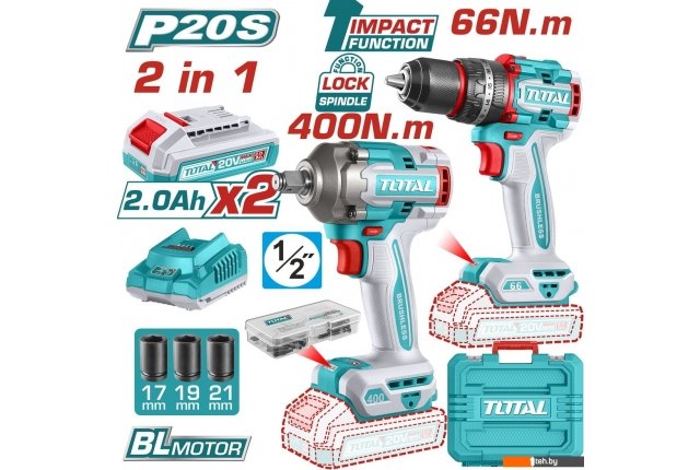 | Комплектация | Дрель-шуруповерт ударная TOTAL TIDLI206681 - 1 шт. Гайковерт TOTAL TIWLI20401 - 1 шт. Аккумулятор 2,0 Ач TFBLI20011 - 2 шт. Зарядное устройство TFCLI2001 - 1 шт. Аксессуары для дрели шуруповерта - 47 шт. Торцевые головки (17, 19, 21 мм) - 3 шт. Инструкция Кейс |