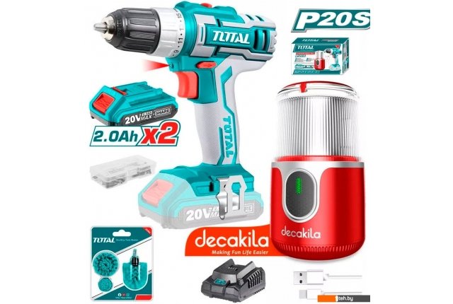 | Комплектация | - Дрель-шуруповерт TOTAL TDLI2002 - 1 шт. - Аккумулятор 2,0 Ач - 2 шт. - Зарядное устройство - 1 шт. - Набор оснастки - 1 шт. - Щетки для дрели-шуруповерта - 3 шт. - Беспроводной мини-измельчитель Decakila KMCF022R- 1 шт. - USB-кабель для зарядки измельчителя - 1 шт. - Коробка |