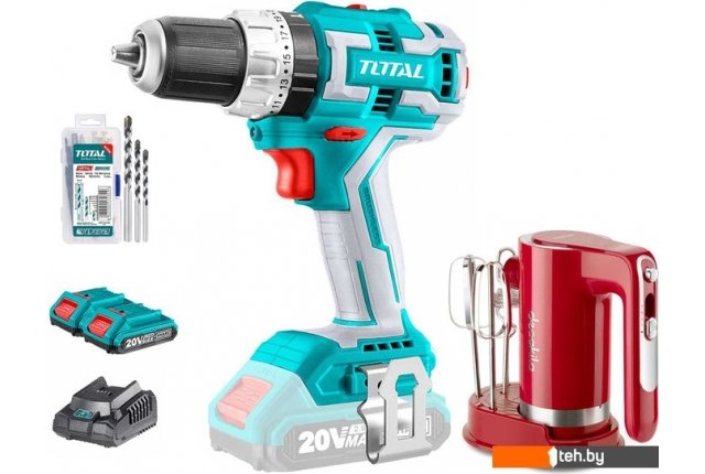 | Комплектация | - Дрель-шуруповерт ударная TOTAL TIDLI20608 - 1 шт. - Аккумулятор 2,0 А*ч - 2 шт. - Быстрое зарядное устройство - 1 шт. - Набор оснастки и крепежа - 50 шт. - Миксер Decakila KMMX006R - 1 шт. - Венчики - 2 шт. - Капучинатор (вспениватель молока) - 1 шт. - Инструкция |