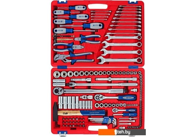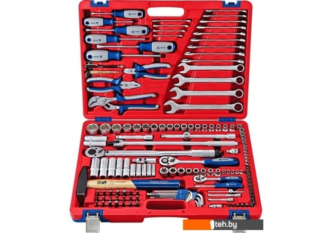 | Комплектация | – Головки торцевые и принадлежности 1/2"Головки торцевые стандартные 6-гранные – 8, 9, 10, 11, 12, 13, 14, 15, 16, 17, 18, 19, 21, 22, 24, 27, 30, 32 ммГоловки торцевые глубокие 6-гранные – 13, 14, 17, 19, 22 ммГоловки торцевые TORX Е-стандарт – E10, E12, E14, E16, E18, E20, E22, E24Головки свечные 12-гранные – 14, 16 ммУдлинители стандартные – 125, 250 ммТрещотка флажковая с кнопкой – 45 зубцов, длина 250 ммВороток с шарниром – 450 ммКардан – 1 шт.Переходник с отверстием для воротка – 3/8" х 1/2"Переходник адаптер для вставок (бит) – F1/2">F5/16" (8 мм)Ключ динамометрический – диапазон усилий: от 42 до 210 Нм– Головки торцевые и принадлежности 1/4"Головки торцевые стандартные 6-гранные – 4, 4.5, 5, 5.5, 6, 7, 8, 9, 10, 11, 12, 13 ммГоловки торцевые глубокие 6-гранные – 8, 10, 11, 12, 13 ммГоловки торцевые TORX Е-стандарт – E4, E5, E6, E7, E8Удлинители стандартные – 75, 100 ммТрещотка флажковая с кнопкой – 45 зубцов, длина 125 ммВороток скользящий Т-образный – 115 ммКардан – 1 шт.Отвертка-вороток – 150 мм– Насадки торцевые 1/4" (6.35 мм)Крестовые Phillips – PH1, PH2Крестовые Pozidrive – PZ1, PZ2Шлицевые Slotted – 5.5, 7 ммTORX – T8, T10, T15, T20, T25, T27, T30Шестигранные – H3, H4, H5, H6, H7– Вставки (биты) 5/16" (8 мм)Крестовые Phillips – PH3, PH4Крестовые Pozidrive – PZ3, PZ4Шлицевые Slotted – 8, 10, 12 ммTORX – T40, T45, T50, T55, T60Шестигранники – Н3, Н4 ,H5, H6, H7SPLINE – M6, M8, M10, M12– КлючиКлючи комбинированные – 6, 7, 8, 9, 10, 11, 12, 13, 14, 15, 16, 17, 18, 19, 21, 22, 24 мм– ОтверткиКрестовые Phillips – №1 х 75 мм, №2 х 100 мм, №3 х 150 ммШлицевые Slotted – 5.5 х 75 мм, 6.5 х 100 мм, 8.0 х 150 мм– Шарнирно-губцевый инструментПлоскогубцы комбинированные – длина 175 ммБокорезы стандартные – длина 150 ммЗахват переставной – длина 250 мм– Прочий инструментНабор шестигранников – 1.5, 2, 2.5, 3, 4, 5, 6, 8, 10 ммМолоток – 500 грМагнит телескопический – 1 шт.Индикатор напряжения – 6-24 В |