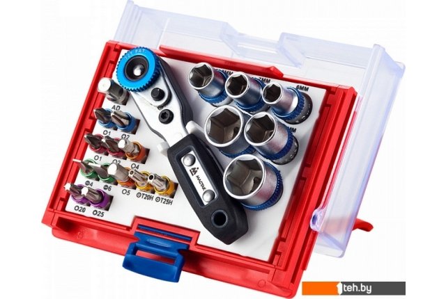 | Комплектация | • Ключ трещоточный 72 зубца / для вставок (бит) / длина 90 мм; • Адаптер для головок 1/4" (6.35 мм) / длина 25 мм; • Головки торцевые 1/4" (6.35 мм) / длина 25 мм / размеры: 6, 7, 8, 10, 12, 13 мм; • Биты 1/4" (6.35 мм) / длина 25 мм: - крестовые Phillips №1, №2 - крестовые Pozidrive №1, №2 - шлицевые Slotted 4, 6 мм - шестигранные Hex 4, 5 мм - Torx T20, T25 - Torx с отверстием T20H, T25H |