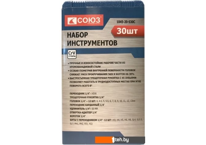 Если хотите купить набор инструментов Союз 1045-20-S30C (30 предметов) то следует уточнить все параметры и габариты модели перед покупкой. Представленые характеристики на сайте 1teh.by могут отличаться от действительных или указанных производителем. Описание, фото товара и технические характеристики представлены для справки.