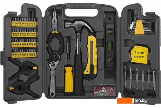 | Комплектация | Тонкогубцы 150 мм; Разводной ключ 150 мм; Молоток 225 г; Уровень 230 мм; Струбцины 100 мм; Держатель для бит; Рулетка 3 м; Нож; Шестигранные ключи 8 шт; Отвёртки для точной механики 6 шт; Биты 40 шт; Набор аксессуаров 80 шт. |