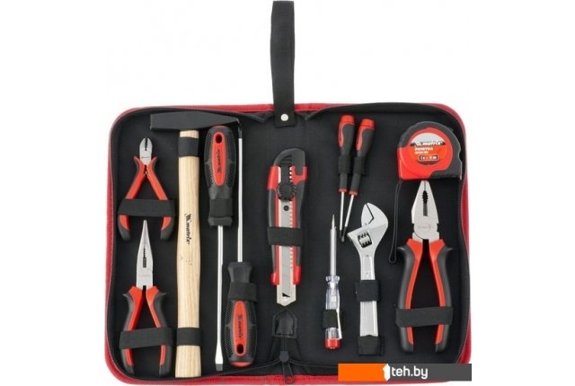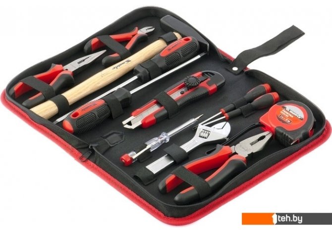 | Комплектация | - длинногубцы,- отвертка-тестер,- пассатижи,- молоток слесарный 200 г,- отвертки SL 6 х 150 мм,- РН 2 х 150 мм,- две часовые отвертки: 2 х 50 мм, РН 00 х 50 мм,- кусачки мини,- ключ разводной,- нож технический 18 мм,- рулетка 3м х 13мм. |