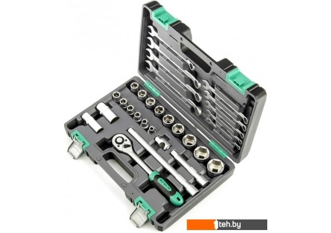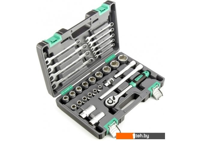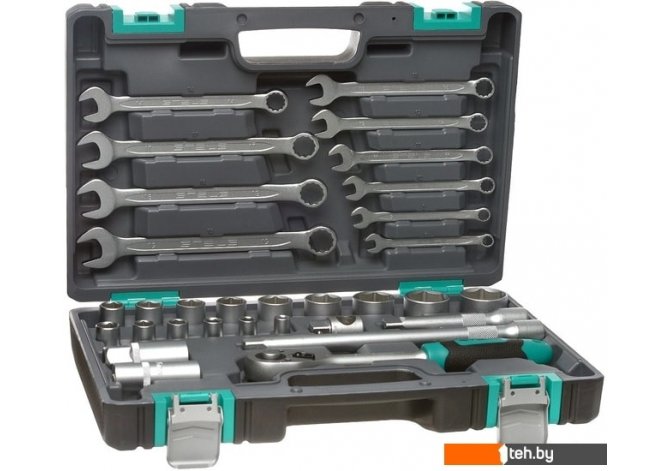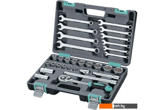 | Комплектация | - Ключ трещоточный 1/2.- Головки торцевые 1/2: 8, 10, 11, 12, 13, 14, 15, 17, 18, 19, 22, 24, 27, 30, 32.- Адаптер трехсторонний 1/2.- Удлинители 1/2: 125 мм и 250 мм.- Головки свечные 1/2: 16 мм и 250 мм.- Ключи комбинированные: 8, 9,10, 11, 12, 13, 14, 17, 18,19. |
