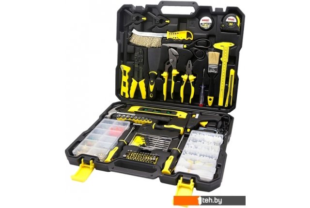 | Комплектация | 1/4 Посадочный квадрат 1/4: 9шт. Головки: 5,6,7,8,9,10,11,12,13мм 2шт. Отвертки: SL.6x100мм, PH.2x100мм 1шт. Отвертка индикаторная 6шт. Отвертки для точных работ: SL:1.4/2.0/2.4/3.0mm, PH:0/1 1шт. Рукоятка-битодержатель 75мм 48шт Биты 25мм: SL 4, SL 5.5, SL 6.5 mm SP4, SP6 Y1,Y2,Y3,Y4 C1 S0,S1,S2 PH0,PH1,PH2,PH3, PZ1,PZ2,PZ3, H2, H2.5,H3,H4,H5,H5.5,H6,H7,H8, H10mm T8,T10,T15,T20,T25,T30,T40 TT8,TT10,TT15,TT20,TT25,TT27,TT30,TT40, TT45,TT50 AD 1шт. Ножницы универсальные 1шт. Клещи для зачистки проводов и обжима клемм 200мм 1шт. Уровень 225мм 1шт. Молоток-гвоздодер 230гр. 1шт. Пассатижи переставные 200мм 1шт. Комбинированные пассатижи 150мм 1шт. Изолента ПВХ 3м 1шт. Рулетка 3м 1шт. Ножовка (250мм полотно) 1шт. Нож универсальный 9мм 2шт. Струбцины пружинные 75мм 1шт. Шпатель 50мм 1шт. Кисть 38мм 1шт. Пластиковый тангенциркуль 1шт. Щетка по металлу 1шт. Клеевой пистолет 2шт. Стержни клеевые 600шт. Набор крепежа (саморезы, дюбели и пр.) 315шт. Набор крепежа для электрики (кабельные крюки, стяжки, клеммы и пр.) 1шт. Пластиковый кейс |