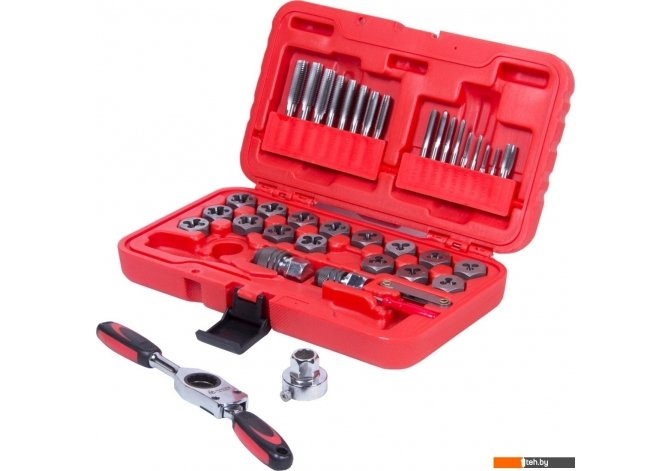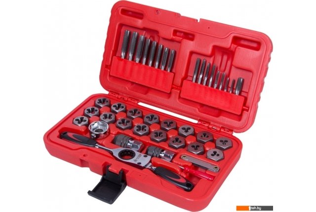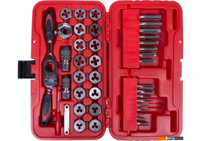 | Комплектация | Метчики и плашки - 34 шт: M3?0.5, M3?0.6, M4?0.7, M4?0.75, M5?0.8, M5?0.9, M6?1.0, M7?1.0, M8?1.25, M9?1.0, M9?1.25, M10?1.25, M10?1.5, M11?1.5, M12?1.5, M12?1.75, 1/8BSP28; Ключ трещоточный – 1 шт; Метчикодержатель M3-M6 – 1 шт; Метчикодержатель M6-M12 – 1 шт; Плашкодержатель – 1 шт; Резьбомер – 1 шт; Отвертка - 1 шт |