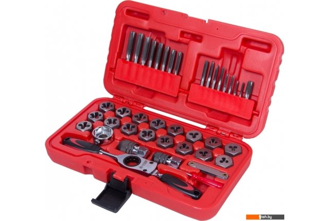 | Комплектация | Метчики и плашки - 34 шт; Ключ трещоточный – 1 шт.; Метчикодержатель M3-M6 – 1 шт.; Метчикодержатель M6-M12 – 1 шт.; Плашкодержатель – 1 шт.; Резьбомер – 1 шт.; Отвертка - 1 шт. |
