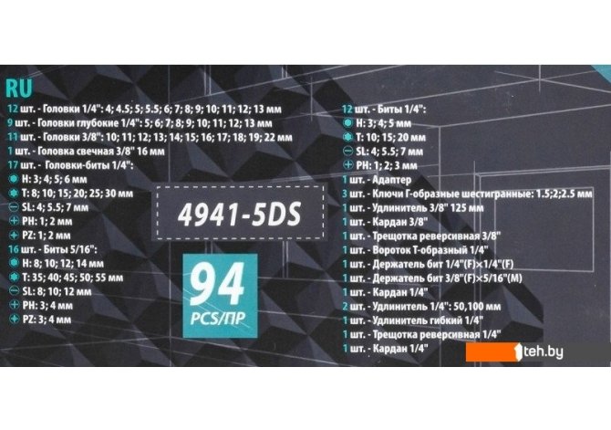 Комплектация | Торцевые шестигранные головки 1/2? (10-32 мм), 1/4? (4-14 мм) Глубокие торцевые головки 1/2? (14-19 мм), 1/4? (6-13 мм) Головки со вставкой шлицевые (SL) (4, 5.5, 7, 8, 10, 12 мм), крестовые (PH) (1, 2, 3, 4), крестовые с насечками (PZ) (1, 2, 3, 4), шестигранные (Hex) (3, 4, 5, 6, 8, 10 , 12, 14 мм), звездочкой (Torx) (T8, T10, T15, T20, T25, T30, T40, T45, T50, T55) Удлинители 1/2? (125, 250 мм), 1/4? (50, 100 мм) |