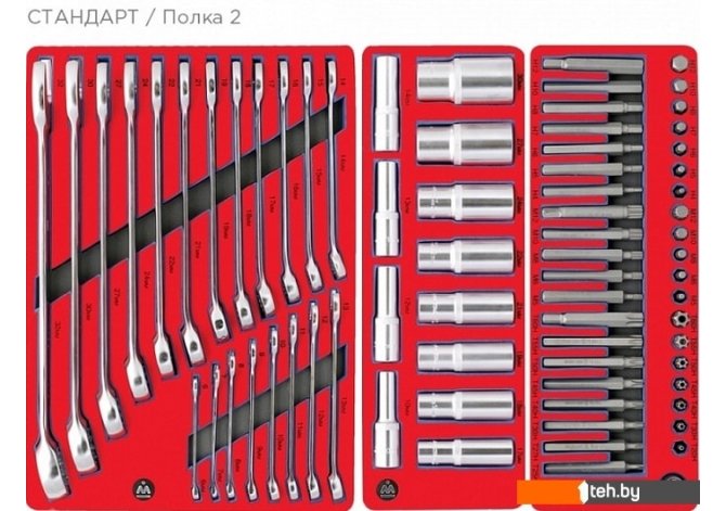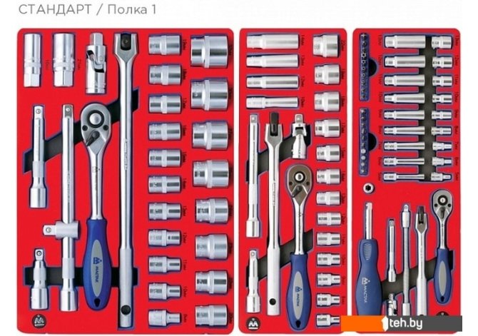 | Комплектация | Инструмент с присоединительным квадратом 1/2" (12.7 мм): Головки торцевые свечные шестигранные с резиновым фиксатором: 16, 21 мм Головки торцевые 12-гранные короткие: 8, 10, 11, 12, 13, 14, 15, 16, 17, 18, 19, 20, 22, 23, 24, 26, 27, 30, 32 мм Вороток реверсивный (трещотка) с флажком: длина 250 мм, 45 зубцов, кнопка быстрого сброса Вороток срывной с шарниром: длина 375 мм Переходник с отверстием для воротка: внутр. 3/8" / внешн. 1/2" Удлинитель качающийся: длина 75 мм Удлинители прямые: длина 125 мм, 250 мм Кардан шарнирный: 1 шт Головки торцевые двенадцатигранные короткие 3/8": 7, 8, 9, 10, 11, 12, 13, 14, 15, 17, 18, 19, 22 мм; Головки торцевые шестигранные глубокие 3/8": 10, 12, 13, 14 мм; Вороток реверсивный (трещотка) с флажком, 45 зубцов и кнопка быстрого сброса 3/8" 200 мм; Вороток срывной с шарниром на 180 градусов 3/8" 230 мм; Удлинители прямые 3/8": 75, 150 мм; Кардан шарнирный 3/8". Головки торцевые шеститигранные короткие: 5, 6, 7, 8, 9, 10, 11, 12, 13 мм Головки торцевые шеститигранные глубокие: 5, 6, 7, 8, 9, 10, 11, 12, 13 мм Вороток реверсивный (трещотка) с флажком: 45 зубцов, кнопка быстрого сброса, длина 125 мм Вороток срывной с шарниром: длина 130 мм Вороток с торцевой рукояткой: длина 150 мм Удлинитель прямой: длина 75 мм Удлинитель гибкий: длина 150 мм Кардан шарнирный: 1 шт Переходник адаптер для вставок 1/4": 1 шт Вставки 1/4": TORX с отверстием: Т10, Т15, Т20, Т25, Т27, Т30, Т40 шестигранники: 3, 4, 5, 6 мм шлицевые: 4, 5, 6 мм Phillips: РН1, РН2, РН3 Pozidrive: PZ1, PZ2, PZ3 Ключи комбинированные рожково-накидные: 6, 7, 8, 9, 10, 11, 12, 13, 14, 15, 16, 17, 18, 19, 21, 22, 24, 27, 30, 32 мм. Головки торцевые шестигранные глубокие 1/2". Размеры: 10, 12, 13, 14, 17, 18, 19, 21, 22, 24, 27, 30 мм. Вставки 10 мм шестигранные, длина 30 мм. Размеры: 4, 5, 6, 7, 8, 10, 12 мм Вставки 10 мм шестигранные, длина 80 мм. Размеры: 4, 5, 6, 7, 8, 10, 12 мм Вставки 10 мм SPLINE, длина 30 мм. Размеры: М5, М6, М8, М10, М12 Вставки 10 мм SPLINE, длина 80 мм. Размеры: М5, М6, М8, М10, М12 Вставки 10 мм TORX с отверстием, длина 30 мм. Размеры: Т20, Т30, Т40, Т45, Т50, Т55, Т60 Вставки 10 мм TORX с отверстием, длина 80 мм. Размеры: Т25, Т27, Т30, Т40, Т45, Т50, Т55, Т60 Переходник адаптер 1/2" для вставок 10 мм Пассатижи комбинированные 180 мм. Плоскогубцы тонконосые загнутые 200 мм. Пассатижи переставные на шарнире с проточкой 250 мм. Съемник стопорных колец с возвратной пружиной прямой на сжим 180 мм. Съемник стопорных колец с возвратной пружиной гнутый на сжим 180 мм. Съемник стопорных колец с возвратной пружиной прямой на разжим 180 мм. Съемник стопорных колец с возвратной пружиной гнутый на разжим 180 мм. Отвертки шлицевые с двухкомпонентной эргономичной ручкой. Размеры: 4х100, 6.5х100, 8х150 мм. Отвертки крестовые с двухкомпонентной эргономичной ручкой. Размеры: 0х75, 1х75, 2х100 мм. Ручной слесарный инструмент: Молоток с деревянной ручкой 500 г. Зубила. Размеры: 10х140, 24х220 мм. Выколотки. Размеры: 3х150, 5х200 мм. Кернер 4х185 мм. |