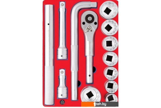 | Комплектация | Стандартные торцевые двенадцатигранные головки 3/4" размером 30, 32, 33, 36, 38, 41, 46, 50 мм; Трещотка с флажком, 45 зубцов и кнопка быстрого сброса 3/4" 260 мм; Вороток L-образный 3/4" 350 мм; Рычаг-удлинитель для трещотки и воротка 350 мм; Удлинители прямые 3/4" размером 100, 200 мм; Ложемент. |