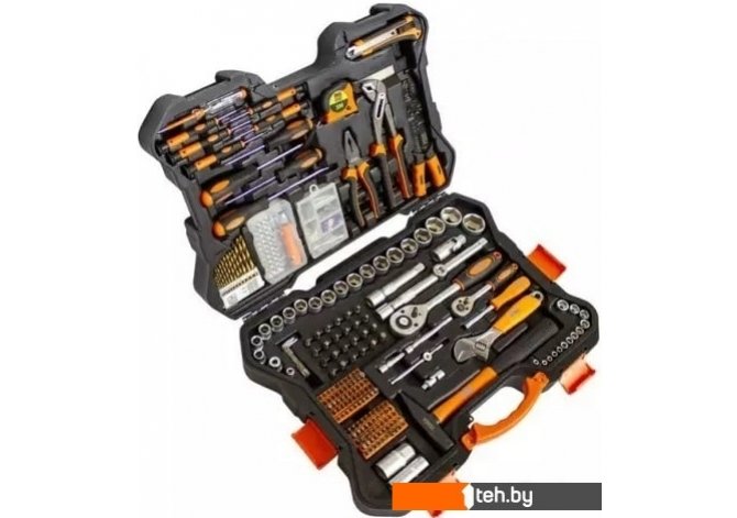 | Комплектация | 13шт. - 1/4"Головки: 4, 4.5, 5, 5.5, 6, 7, 8, 9, 10, 11, 12, 13, 14мм 18шт. - 1/2"Головки: 10, 11, 12, 13, 14, 15, 16, 17, 18, 19, 20, 21, 22, 23, 24, 27, 30, 32мм 1шт. - 1/4"Трещотка реверсивная 1шт. - 1/4"Т-образный вороток 2шт. - 1/4"Удлинители: 50, 100мм 1шт. - 1/4"Кардан шарнирный 1шт. - 1/4"Рукоятка 150мм 1шт. - Битодержатель 1/4"(F) x 1/4"(F) 25мм 1шт. - 1/2"Трещотка реверсивная 2шт. - 1/2"Удлинители: 125, 250мм 1шт. -1/2 Адаптер с отверстием 1шт. - 1/2"Кардан шарнирный 2шт. - 1/2"Свечные головки: 16, 21мм 1шт. -Битодержатель 1/2""(F)x5/16""(F) 24шт. -Биты 5/16"х 30мм: "SL: 5.5-6.5-7-8мм PH: 3-4 PZ: 3-4 H: 5.5-6.5-7-8мм M: 5-6-8-10 T:25-27-30-35-40x2-45-50" 1шт. - Ключ разводной 8" 1шт. - Молоток 300гр. 1шт. - Клещи для снятия изоляции и обжимки клемм 9" 1шт. - Комбинированные пассатижи 7" 1шт. - Переставные пассатижи 10" 1шт. - Нож универсальный 10шт. - Лезвия для ножа в чехле 1шт. - Рулетка 3м х 16мм "4шт. - Отвертки: SL: 4x100, 6.5x125мм PH: 1 x 80, 2 x 100мм" "5шт. - Отвертки для точных работ: SL: 2.5-3.0мм PH: 0-00-000" 1шт. - Отвертка индикаторная 7шт. - Набор ключей Г-образных HEX: 1.27, 1.5, 2, 2.5, 3, 4, 5мм "30шт. - Набор бит для точных работ H4мм: PH: 000-00-0-1-2 SL: 1.5-2-2.5-3-4мм T: 4-5-6-8-9-10 Y: 2-3 TA:2-2.3 H: 1.5-2-2.5-3-3.5-4мм SP: 2.3мм TS: 1-4-5 1шт - Удлинитель-битодержатель 100мм 1шт - Рукоятка-битодержатель 100мм" "100шт - Биты 25мм: SL: 3-4-4.5-5-5.5-6-6.5-7-8мм C:1-2-3 S: 0-1-2-3 Torg: 6-8-10мм M: 5-6-8 T: 8-10-15-20-25-27-30-35-40-45 SP: 4-6-8-10мм tri wing: 1-2-3-4 PH: 0x2-1X2-2X4-3X2 PZ0x2, PZ1x2, PZ2x4, PZ3x2 T hole: 8H-10H-15H-20H-25H-27H-30H-35H-40H H: 1.5, 2, 2.5, 3, 4, 5, 5.5, 6, 8мм H hole: 2-2.5-3-4-5-6-5/64-3/32-7/64-1/8-9/64-5/32 H: 1/16-5/64-3/32-7/64-1/8-9/64-5/32-3/16-7/32-1/4""" 13шт. - Сверла по металлу : 1.5, 2.0, 2.5, 3.0, 3.2, 3.5, 4.0, 4.5, 4.8, 5.0, 5.5, 6.0, 6.5мм 54шт. - Набор крепежа 1шт. - Пластиковый кейс |