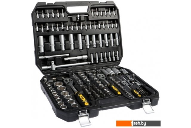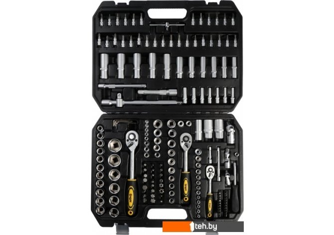 | Комплектация | Посадочный размер 1/2" торцевые головки, 17 шт.: 10, 11, 12, 13, 14, 15, 16, 17, 18, 19, 20, 21, 22, 24, 27, 30, 32 мм торцевые головки удлиненные 75 мм, 5 шт.: 16, 17, 18, 19, 22 мм торцевые головки свечные, 2 шт.: 16 и 21 мм торцевые головки Е-образные, 2 шт.: 20 и 24 мм вороток с трещоткой: 250 мм удлинитель для воротка с адаптером 1/2" х 3/8": 250 мм удлинитель для воротка 125 мм шарнир карданный Посадочный размер 3/8" торцевые головки, 10 шт.: 10, 11, 12, 13, 14, 15, 16, 17, 18, 19 мм торцевые головки удлиненные 65 мм, 6 шт.: 10, 11, 12, 13, 14, 15 мм торцевая головка свечная, 21 мм торцевые головки Е-образные 3/8", 6 шт. (10, 11, 12, 14, 16, 18 мм) вороток с трещоткой: 200 мм удлинитель для воротка: 150 мм адаптер для воротка 3/8" х 1/2" шарнир карданный Посадочный размер 1/4" торцевые головки, 13 шт.: 4, 4.5, 5, 5.5, 6, 7, 8, 9, 10, 11, 12, 13, 14 мм торцевые головки удлиненные 50 мм, 7 шт.: 4, 5, 6, 7, 8, 9, 10 мм торцевые головки Е-образные, 5 шт.: 4, 5, 6, 7, 8 мм вороток с трещоткой: 150 мм вороток Т-образный: 110 мм вороток-отвертка: 150 мм удлинители для воротка, 2 шт.: 50, 100 мм шарнир карданный ключи шестигранные, 7 шт.: 1, 1.5, 2, 2.5, 3, 4, 5 мм адаптеры для бит, 3 шт.: 1/4" х 1/4", 3/8" х 5/16", 1/2" х 5/16" биты 5/16", 24 шт. (PH3-4, PZ3-4, SL8-10-12, Н7-8-10-12-14, T40-45-50-55-60-70, TT40-45-50-55-60-70 биты с торцевыми головками 1/4", 30 шт.: PH1-2-3, PZ1-2-3, SL4-5.5-7, Н2-3-4-5-6, T8-T9-10-15-20-25-27-30, TT8-9-10-15-20-25-27-30 биты 1/4", 20 шт. |