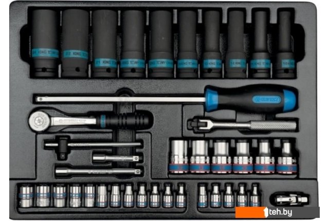 | Комплектация | • Головки торцевые ударные глубокие шестигранные 1/2" KING TONY (4435M): 10, 11, 12, 13, 14, 17, 19, 21, 22, 24;• Головки торцевые TORX Е-стандарт 1/2", L = 37 мм KING TONY (4375M): E10, E12, E14, E16, E18, E20;• Головки торцевые TORX Е-стандарт 1/4", L = 24 мм KING TONY (2375M): E4, E5, E6, E7, E8;• Головки торцевые стандартные шестигранные 1/4" KING TONY (2335M): 4, 4.5, 5, 5.5, 6, 7, 8, 9, 10, 11, 12, 13;• Отвертка вороток 1/4", 310 мм, двухкомпонентная ручка KING TONY 2177DF;• Трещотка 1/4", 140 мм, 72 зубца, дисковый механизм KING TONY 2755-55G;• Вороток 1/4", 125 мм, с шарниром KING TONY 2452-05F;• Вороток 1/4", 115 мм, скользящий KING TONY 2571-45;• Удлинитель 1/4", 50 мм KING TONY 2221-02;• Удлинитель 1/4", 100 мм KING TONY 2221-04;• Кардан 1/4" KING TONY 2792. |