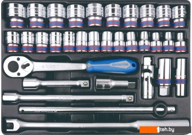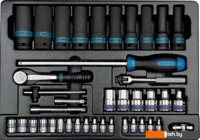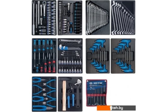 | Комплектация | • Головки торцевые стандартные шестигранные 1/2": 8, 9, 10, 11, 12, 13, 14, 15, 16, 17, 18, 19, 20, 21, 22, 23, 24, 25, 26, 27, 28, 29, 30, 32 мм;• Головка свечная шестигранная 1/2", 21 мм, L = 70 мм;• Головка свечная шестигранная 1/2", 16 мм, L = 70 мм;• Кардан 1/2;• Удлинитель 1/2", 75 мм;• Удлинитель 1/2", 125 мм;• Удлинитель 1/2", 250 мм;• Трещотка 1/2", 250 мм, 32 зубца, флажковая, фиксатор;• Вороток 1/2", 380 мм, с шарниром;• Вороток 1/2", 300 мм, скользящий.• Головки торцевые ударные глубокие шестигранные 1/2": 10, 11, 12, 13, 14, 17, 19, 21, 22, 24;• Головки торцевые TORX Е-стандарт 1/2", L = 37 мм: E10, E12, E14, E16, E18, E20;• Головки торцевые TORX Е-стандарт 1/4", L = 24 мм: E4, E5, E6, E7, E8;• Головки торцевые стандартные шестигранные 1/4": 4, 4.5, 5, 5.5, 6, 7, 8, 9, 10, 11, 12, 13;• Отвертка вороток 1/4", 310 мм, двухкомпонентная ручка;• Трещотка 1/4", 140 мм, 72 зубца, дисковый механизм;• Вороток 1/4", 125 мм, с шарниром;• Вороток 1/4", 115 мм, скользящий;• Удлинитель 1/4", 50 мм;• Удлинитель 1/4", 100 мм;• Кардан 1/4".• Ключи комбинированные, Размеры: 8, 10, 11, 12, 13, 14, 15, 17, 18, 19, 21, 22 24, 27, 30, 32• Ключи накидные: Размеры: 6x7, 8x9, 10x11, 12x13, 14x15, 16x17, 18x19, 20x22, 21x23, 24x27, 30x32• Отвертки крестовые Phillips: Размеры: NO.1x80, NO.2x38, NO.2x100, NO.3x150• Отвертки шлицевые Slotted: Размеры: 3x75, 4x100, 5.5x125, 6.5x38, 6.5x150, 8x175• Насадки (биты) торцевые 1/2", TORX, L=80 мм KING TONY (4033)Размеры: T20, T25, T27, T30, T40, T45, T50, T55, T60• Насадки (биты) торцевые 1/2", HEX, L=80 мм: Размеры: 4, 5, 6, 7, 8, 10, 12, 14, 17• Шестигранники Г-образные, с шаровым окончанием: Размеры: 1.5, 2, 2.5, 3, 4, 5, 6, 8, 10• Ключи разрезные: Размеры: 10x11, 12x14, 14x17• Съемник масляных фильтров, 60-140 мм, цепной.• Ключи L-образные HEX: Размеры: 2, 2.5, 3, 4, 5, 6, 8, 10• Ключи L-образные TORX: Размеры: T10, T15, T20, T25, T30, T40, T45, T50• Плоскогубцы комбинированные серии 6111-08 - 200 мм;• Бокорезы серии 6211-06 - 160 мм;• Плоскогубцы тонконосые серии 6311-06 - 160 мм;• Съемник для стопорных колец, прямые, сжатие: 180 мм;• Съемник для стопорных колец, загнутые, сжатие: 180 мм;• Съемник для стопорных колец, прямые, разжатие: 180 мм;• Съемник для стопорных колец, загнутые, разжатие: 180 мм.• Ключ разводной Chrome: 300 мм;• Захват переставной: 250 мм;• Молоток квадратный: 800 гр.• Выколотки: Размеры: 2x30, 3x40, 4x50, 5x50, 6x50, 8x50 |