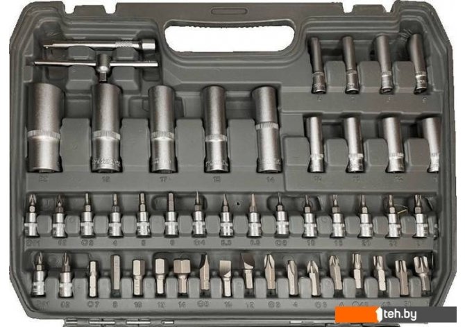 | Комплектация | Головки торцевые 6 граней ?: 10-32 мм Головки удлиненные ?: 14-22 мм Головки торцевые TORX ?: E10-24 Биты (30 мм L) – HEX: 7-14 мм, SL8-10-12, PH3-4, PZ3-4, T40-60 Свечные головки ?: 16 и 21 мм Трещотка ?: 72 зуба Удлинители ?: 125 и 250 мм Адаптер 3 way Адаптер для бит ? Головки торцевые 6 граней ?: 4-14 мм Головки удлиненные 6 граней ?: 6-13 мм Головки торцевые TORX ?: E4-8 Биты ?: SL4-6.5, T8-30. PH1-2, PZ1-2, HEX:3,4,5,6 Трещотка ?: 72 зуба Отвертка-держатель ?: для бит Удлинители ?: 50 и 100 мм Карданы шарнирные ? и ? Вороток ? Соединитель ?* ? Адаптер для бит Ключи шестигранные Г-образные: 1,5-2,5 мм |