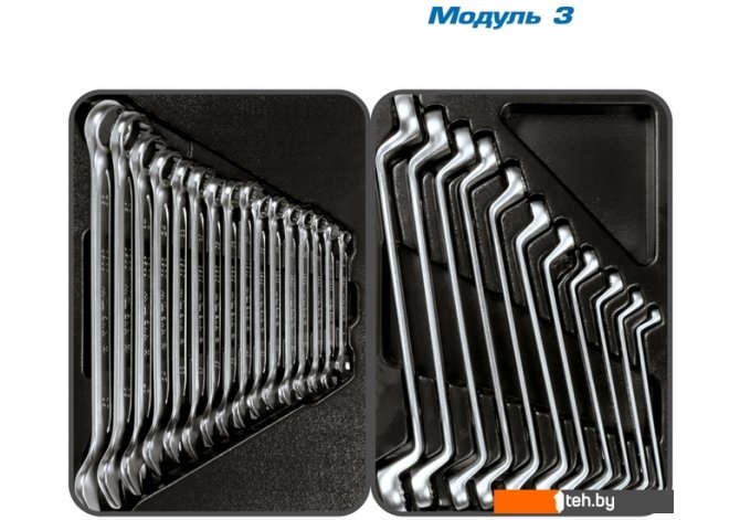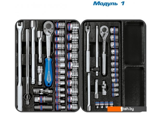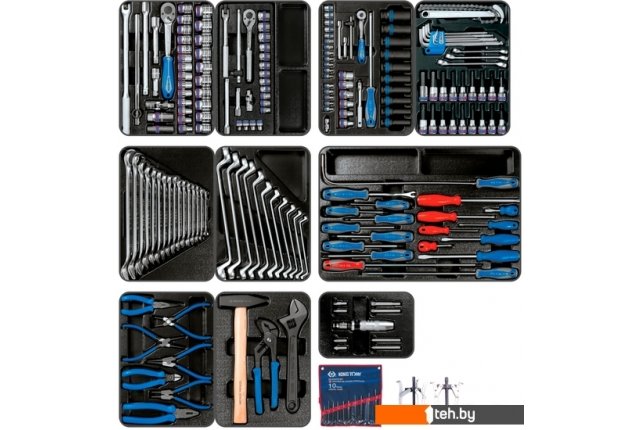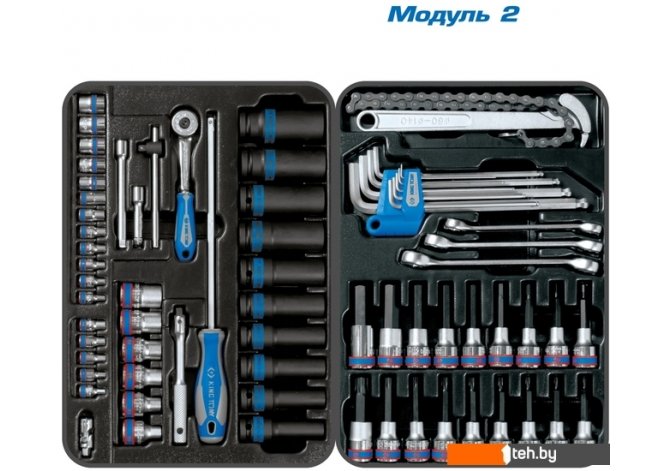 | Комплектация | Модуль 1 Набор торцевых головок 1/2" с принадлежностями 9-4333MR03 33 Набор торцевых головок 3/8" с принадлежностями 9-3523MR 23 Модуль 2 Набор ударных головок 1/2" и торцевых головок 1/4" с принадлежностями 9-7540MR 40 Набор торцевых насадок, шестигранники Г-образные и разрезные ключи 9-90131MR 31 Модуль 3 Набор комбинированных ключей 9-1216MR03 16 Набор накидных ключей 9-1711MR 11 Модуль 4 Набор отверток, съемник клипс и гибкий магнит 9-31919MR 19 Модуль 5 Набор съемников стопорных колец, пассатижей и бокорезов 9-40207GP 7 Набор переставные клещи, разводной ключ и молоток 9-90103PP02 3 Модуль 6 Набор отвертка ударная 5/16" с принадлежностями 9-4128FR 10 Набор выколоток, бородков, кернеров 1010PR 10 Съемник подшипников 3-х захватный 100 мм 7963-04 1 Съемник подшипников 2-х захватный 100 мм 7962-04 1 Технические характеристики Материалы – инструментальные стали Cr-V, Cr-Mo, SNCM+V (S2), конструкционная сталь, хром, пластики PP, вспененный PVC, PP+TPR (рукояти отверток, трещоток, шарнирно-губцевого инструмента), дерево (рукоять молотка), PVC (ложемент) Размеры упаковки – 575 ? 540 ? 420 мм Вес – 31,7 кг |