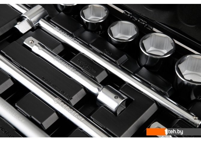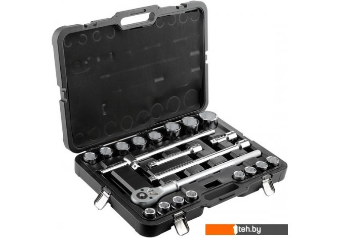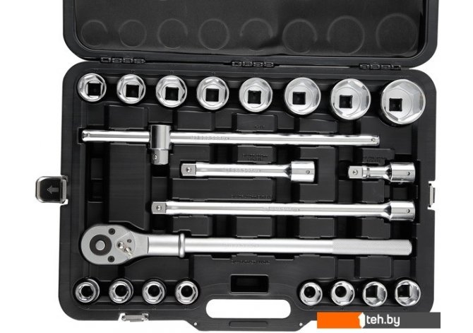 | Комплектация | - 16 шт: 3/4" Головки торцевые 6-гранные: 19, 21, 22, 23, 24, 26, 27, 29, 30, 32, 35, 36, 38, 41, 46, 50 мм- 1 шт: 3/4" Трещотка (ключ трещоточный с быстрым сбросом): 24 зуба, 500 мм- 3 шт: 3/4" Удлинитель: 100, 200, 400 мм- 1 шт: 3/4" Удлинитель со скользящим переходником: 450 мм |