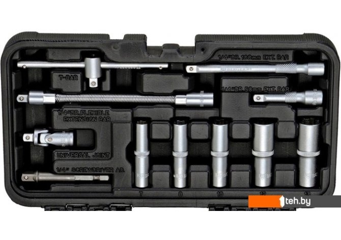 | Комплектация | - 13 шт.: 1/4" Головки торцевые 6-гранные Super Lock: 4, 4.5, 5, 5.5, 6, 7, 8, 9, 10, 11, 12, 13, 14 мм- 5 шт.: 1/4" Головки торцевые длинные 6-гранные Super Lock: 7, 8, 10, 12, 13 мм- 1 шт.: 1/4" Трещотка (ключ трещоточный с быстрым сбросом): 45 зубов- 1 шт.: 1/4" Вороток Т-образный: 110 мм- 1 шт.: Отвертка с присоединительным квадратом- 1 шт.: Гибкий удлинитель: 150 мм- 2 шт.: 1/4" Удлинитель: 50 мм, 100 мм- 1 шт.: 1/4" Кардан шарнирный- 1 шт.: 1/4" Адаптер для бит- 16 шт.: 1/4" Биты:Ph (крест): 1, 2, 2, 3 Pz (позидрайв): 0, 2 TORX (звёздочка): T10, T15, T20, T25SLOT (шлиц): 4, 6, 7HEX (шестигранник): 4, 5, 6- 1 шт.: 1/4" Адаптер для шуруповерта |