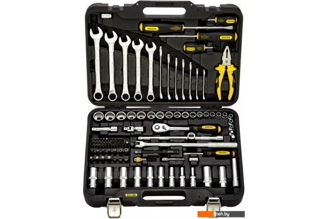 | Комплектация | 19 шт.: 3/8” Головка торцевая 12-гранная: 6, 7, 8, 9, 10, 11, 12, 13, 14, 15, 16, 17, 18, 19, 20, 21, 22, 23, 24 мм 9 шт.: 3/8” Головка торцевая удлиненная 12-гранная: 7, 8, 10, 12, 13, 15, 17, 18, 19 мм 1 шт.: 3/8” Головка свечная 12-гранная магнитная 90 мм: 14 мм 2 шт.: 3/8” Головка свечная 12-гранная магнитная: 16, 21 мм 1 шт.: 3/8” Трещотка (ключ трещоточный с быстрым сбросом): 45 зубов 2 шт.: 3/8” Удлинитель: 75, 250 мм 1 шт.: 3/8” Переходник скользящий 1 шт.: 3/8” Кардан шарнирный 1 шт.: 3/8” Вороток шарнирный: 300 мм 1 шт.: 3/8 Адаптер для шуруповерта 1 шт.: Переходник 3/8”×1/4” 1 шт.: Переходник 1/4”×3/8” 1 шт.: 1/4” Отвертка с присоединительным квадратом: 150 мм 24 шт: 1/4” Набор бит: TORX (звёздочка): Т8, Т10, Т15, T20, T25, Т27, T30, SLOT (шлиц): 3, 4, 5, 6, 7, PH (крест): 0, 1, 2, PZ (позидрайв): 1, 2, HEX (шестигранник): 1.5, 2, 2.5, 3, 4, 5, 6 1 шт.: 1/4” Держатель для бит магнитный (для шуруповерта) 1 шт.: 1/4” Адаптер для бит 14 шт.: 5/16” Биты: HEX (шестигранник): 7, 8, 9, 10, SLOT (шлиц): 8, 10, 12, Ph (крест): 3, 4, TORX (звёздочка): T40, T45, T50, T55, T60 1 шт.: 5/16” Адаптер для бит 12 шт.: Ключи комбинированные: 7, 8, 10, 11, 12, 13, 14, 15, 16, 17, 18, 19 мм 4 шт.: Отвертки: PH (крест): 2 х 38, PH2 х 125, SLOT (шлиц): 6.5 х 38, 8 х 150 1 шт.: Пассатижи: 180 мм 1 шт.: Ручка магнитная телескопическая |