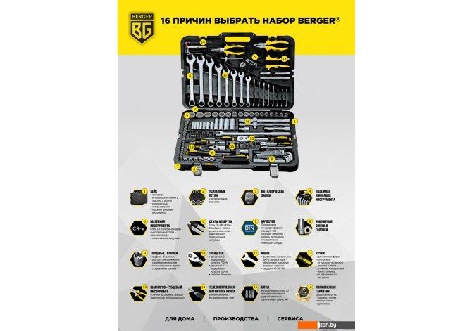Если хотите купить набор инструментов Berger BG151-1214 (151 предмет) то следует уточнить все параметры и габариты модели перед покупкой. Представленые характеристики на сайте 1teh.by могут отличаться от действительных или указанных производителем. Описание, фото товара и технические характеристики представлены для справки.
