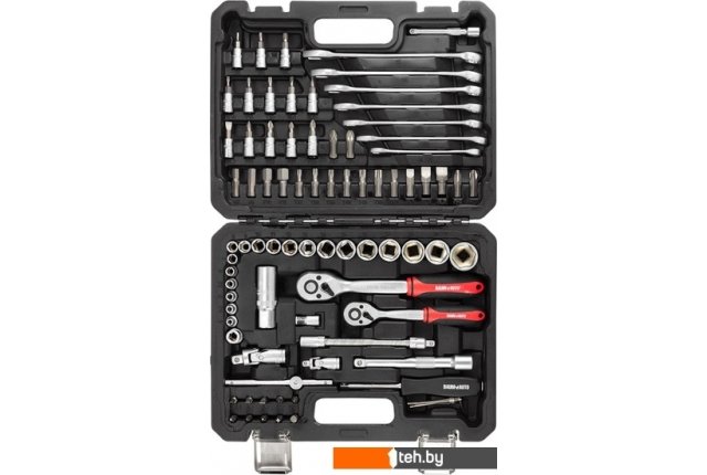 | Комплектация | Торцевые головки 3/8? (14, 15, 16, 17, 18, 19, 22 мм), 1/4? (4, 4.5, 5, 5.5, 6, 7, 8, 9, 10, 11, 12, 13 мм) Головки со вставкой шлицевые (SL) (SL4, SL5.5, SL7), крестовые (PH) (РН1, РН2), крестовые с насечками (PZ) (PZ1, PZ2), шестигранные (Hex) (Н3, Н4, Н5), звездочкой (Torx) (Т10, Т15, Т20) Насадки-биты шлицевые (SL) (SL3, SL4, SL6, SL7, SL8, SL10, SL12), крестовые (PH) (РН1, РН2, РН3, РН4), крестовые с насечками (PZ) (PZ0, PZ1, PZ2, PZ3, PZ4), шестигранные (Hex) (Н7, Н8, Н10, Н12), звездочкой (Torx) (Т27, Т30, Т35, Т40, Т45, Т50) Удлинители 3/8? (125 мм), 1/4? (75 мм), гибкий удлинитель Кардан 3/8?, 1/4? Ключи Ключи вороток (1 шт.), комбинированный (7 шт.), угловой шестигранный (3 шт.) Воротки T-образный Размер ключа 8 мм, 10 мм, 11 мм, 12 мм, 13 мм, 14 мм, 15 мм, 1.5 мм, 2 мм, 2.5 мм |
