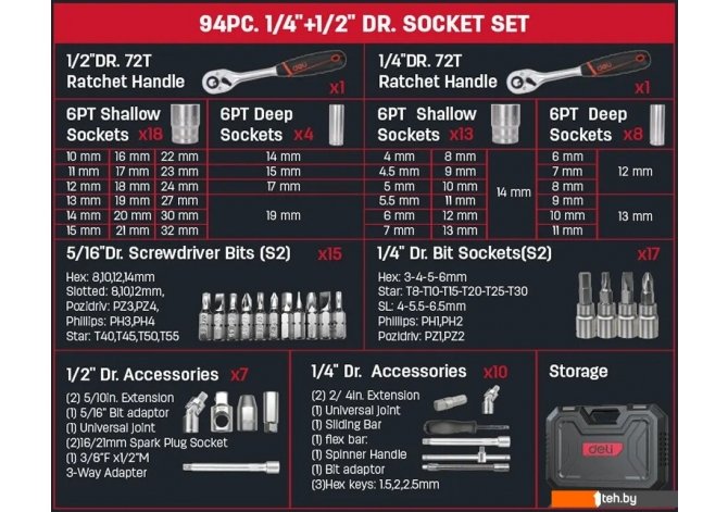 Если хотите купить набор инструментов Deli EDQ44094 (94 предмета) то следует уточнить все параметры и габариты модели перед покупкой. Представленые характеристики на сайте 1teh.by могут отличаться от действительных или указанных производителем. Описание, фото товара и технические характеристики представлены для справки.