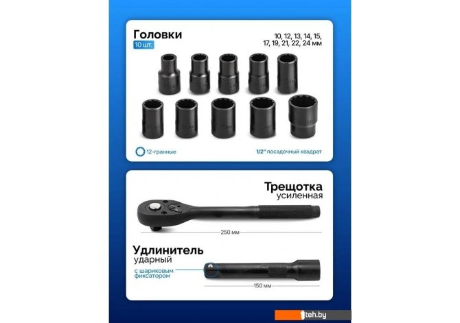 | Комплектация | трещотка (1 шт.), головки (10 шт.), удлинитель (1 шт.), кейс (1 шт.) |