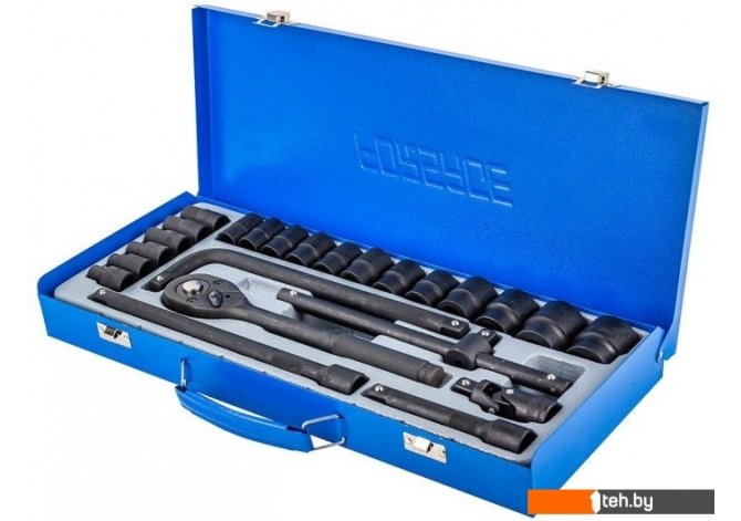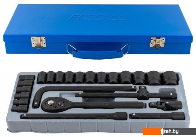 | Комплектация | Оснастка головки (18 шт.), удлинители (2 шт.), кардан (1 шт.) Головки торцевые (18 шт.) Торцевые головки 1/2? (8–21, 22, 24, 27, 30, 32 мм) Удлинители 1/2? (125, 250 мм) Ключи Ключи вороток (2 шт.) Воротки T-образный, Г-образный (250 мм) |