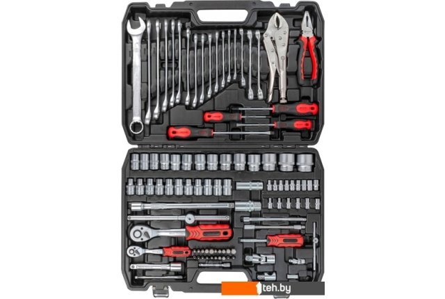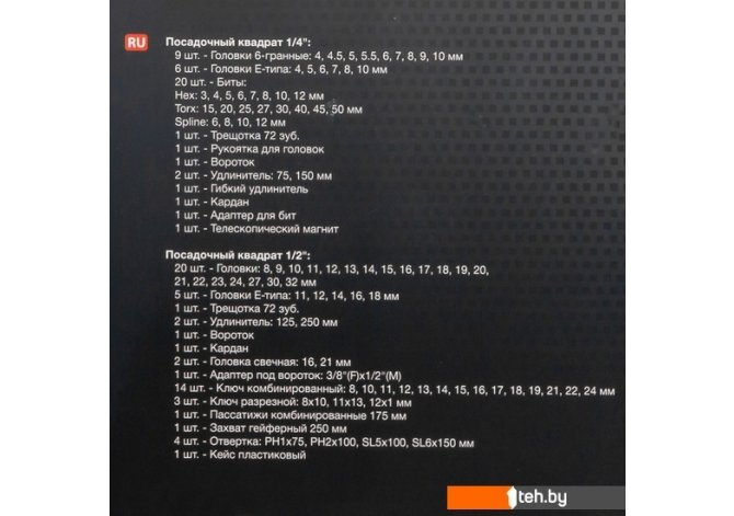 | Комплектация | Инструменты в наборе трещотка (2 шт.), отвертка (4 шт.), пассатижи (1 шт.), ключ гаечный (19 шт.) Трещотка 1/2? (72 зубца), 1/4? (72 зубца) Отвертки шлицевая (SL) (2 шт.), крестовая (PH) (2 шт.) Доп. комплектация телескопический магнит (1 шт.), захват гейферный (1 шт.), кейс (пластиковый) Оснастка головки (42 шт.), насадки-биты (20 шт.), удлинители (5 шт.), кардан (2 шт.), адаптер для бит (1 шт.), адаптер (2 шт.) Головки торцевые шестигранные (29 шт.), торцевые Е-тип (11 шт.), свечные (2 шт.) Торцевые шестигранные головки 1/2? (8, 9, 10, 11, 12, 13, 14, 15, 16, 17, 18, 19, 20 мм), 1/4? (4, 4.5, 5, 5.5, 6, 7, 8, 9, 10 мм) Торцевые головки E-тип 1/2? (Е11, Е12, Е14, Е16, Е18), 1/4? (Е4, Е5, Е6, Е7, Е8, Е10) Головки со вставкой шестигранные (Hex) (Н3, Н4, Н5, Н6, Н7, Н8, Н10, Н12), звездочкой (Torx) (Т15, Т20, Т25, Т27, Т30, Т40, Т45, Т50), 12-гранные Spline (6, 8, 10, 12 мм) Удлинители 1/2? (125, 250 мм), 1/4? (75, 150 мм), гибкий удлинитель Кардан 1/2?, 1/4? Ключи вороток (2 шт.), комбинированный (14 шт.), разрезной (3 шт.) Размер ключа 8 мм, 10 мм, 11 мм, 12 мм, 13 мм, 14 мм, 15 мм, 17 мм, 16 мм, 18 мм, 19 мм, 22 мм, 24 мм, 21 мм |
