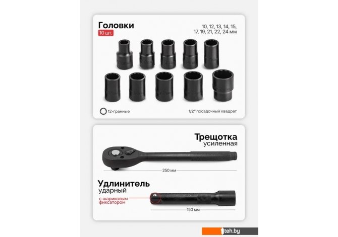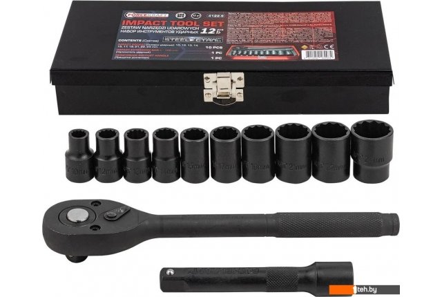 | Комплектация | головки торцевые 12-гранные (10, 12, 13, 14, 15, 17, 19, 21, 22, 24 мм); усиленная трещотка (1 шт.); удлинитель ударный (1 шт.); прочный металлический кейс (1 шт.) |