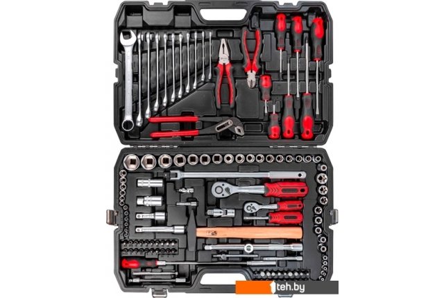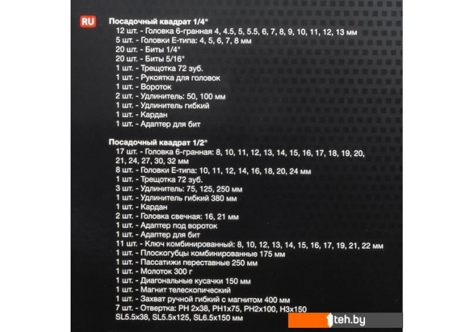 | Комплектация | Инструменты в наборе трещотка (2 шт.), отвертка (7 шт.), кусачки (1 шт.), пассатижи (1 шт.), плоскогубцы (1 шт.), молоток (1 шт.), ключ гаечный (12 шт.) Трещотка 1/2? (72 зубца), 1/4? (72 зубца) Отвертки шлицевая (SL) (3 шт.), крестовая (PH) (3 шт.), шестигранная (Hex) (1 шт.) Доп. комплектация рукоятка (1 шт.), кейс (пластиковый), захват (1 шт.), магнит телескопический (1 шт.) Оснастка головки (44 шт.), насадки-биты (40 шт.), удлинители (7 шт.), кардан (2 шт.), адаптер для бит (1 шт.), адаптер (1 шт.) Головки торцевые шестигранные (29 шт.), торцевые Е-тип (13 шт.), свечные (2 шт.) Торцевые шестигранные головки 1/2? (8, 10, 11, 12, 13, 14, 15, 16, 17, 18, 19, 20, 21, 24, 27, 30, 3), 1/4? (4, 4.5, 5, 5.5, 6, 7, 8, 9, 10, 11, 12, 13 мм) Торцевые головки E-тип 1/2? (Е10, Е11, Е12, Е14, Е16, Е18, Е20, Е24), 1/4? (Е4, Е5, Е6, Е7, Е8) Удлинители 1/2? (75, 125, 250 мм), 1/4? (50, 100 мм), гибкий удлинитель (2 шт.) Кардан 1/2?, 1/4? Ключи вороток (1 шт.), комбинированный (11 шт.) Размер ключа 8 мм, 10 мм, 12 мм, 13 мм, 14 мм, 15 мм, 17 мм, 16 мм, 19 мм, 22 мм, 21 мм |
