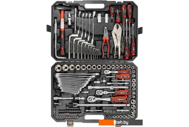| Комплектация | Головки торцевые (42 шт.), торцевые Е-тип (10 шт.), свечные (2 шт.) Торцевые головки 1/2? (8, 10, 12–24, 27, 30, 32 мм), 3/8? (6–19, 21, 22 мм), 1/4? (4, 4.5, 5, 5.5, 6, 7, 8, 9, 10 мм) Торцевые головки E-тип 3/8? (Е10, Е12, Е14, Е18, Е20), 1/4? (Е4, Е5, Е6, Е7, Е8) Головки со вставкой шлицевые (SL) (SL3, SL4, SL5, SL5.5, SL6, SL6.5, SL7), крестовые (PH) (РН1, РН2, РН3), крестовые с насечками (PZ) (PZ1, PZ2, PZ3), шестигранные (Hex) (Н3, Н4, Н5, Н6, Н7, Н8), звездочкой (Torx) (Т10, Т15, Т20, Т25, Т27, Т30, Т40) Удлинители 1/2? (125, 250 мм), 3/8? (75, 150 мм), 1/4? (50, 100 мм), гибкий удлинитель Кардан 1/2?, 3/8?, 1/4? Ключи Ключи вороток (2 шт.), комбинированный (17 шт.), угловой шестигранный (10 шт.), разрезной (5 шт.) Воротки T-образный (115 мм), Г-образный (250 мм) Размер ключа 8 мм, 10 мм, 11 мм, 12 мм, 13 мм, 14 мм, 15 мм, 17 мм, 16 мм, 18 мм, 19 мм, 22 мм, 24 мм, 2.5 мм, 3 мм, 4 мм, 5 мм, 6 мм, 7 мм, 21 мм |