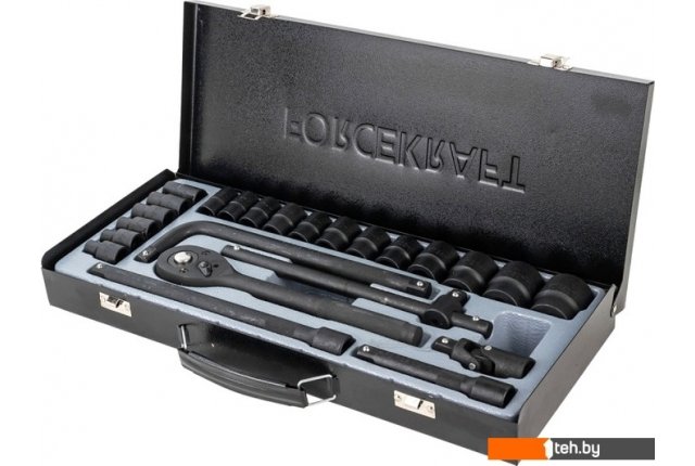 | Комплектация | Торцевые головки 1/2? (8, 9, 10, 12–22, 24, 27, 30, 32 мм) Удлинители 1/2? (125, 250 мм) Кардан 1/2? Ключи Ключи вороток (1 шт.) Воротки Г-образный (250 мм) |