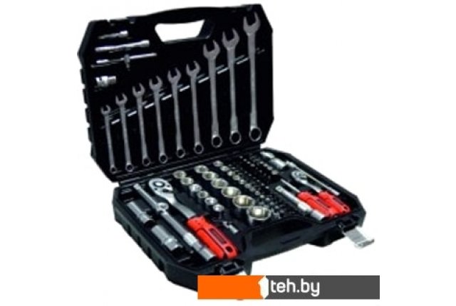 | Комплектация | - Торцевые головки 1/2" : 12 предмет(ов) (14, 15 ,16, 17, 18, 19, 20, 22, 24, 27, 30, 32 мм)- Торцевые головки 1/4" : 13 предмет(ов) (4, 4.5, 5, 5.5, 6, 7, 8, 9, 10, 11, 12, 13, 14 мм)- Трещотка : 1/2", 1/4"- Т-образный вороток : 1/2", 1/4"- Кардан: 1/2", 1/4"- Удлинители 1/2" : 2 предмет(ов) (125 мм, 250 мм)- Удлинители 1/4" : 2 предмет(ов) (50 мм, 100 мм)- Переходник : 3/8"(m)x1/2"(f)- Комбинированные ключи : 9 предмет(ов) (8, 10, 11, 12, 13, 14, 17, 19, 22 мм)- Угловые шестигранные ключи : 3 предмет(ов) (1.5, 2, 2.5 мм)- Отвертка под биты : 1/4"- Биты (насадки-отвертки) - Головки со вставкой- Головки свечные |
