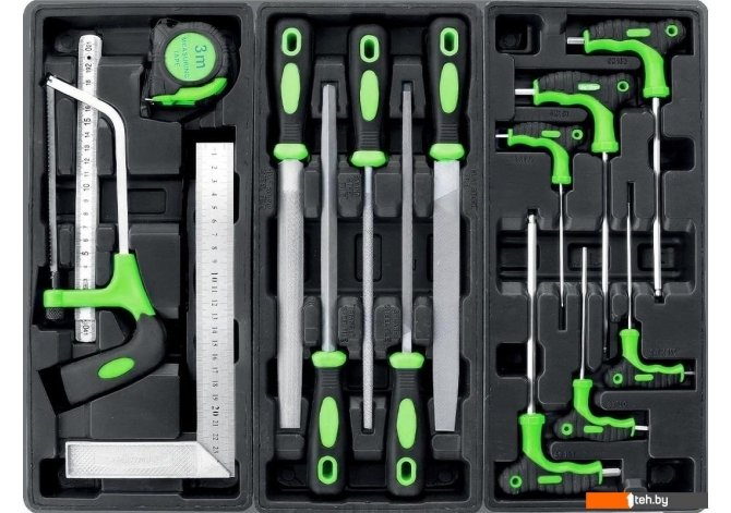| Комплектация | Инструменты в наборе ключ гаечный (52 шт.), напильник (5 шт.), ножовка (1 шт.), молоток (1 шт.), зажим (1 шт.), пассатижи (1 шт.), утконосы (2 шт.), кусачки (1 шт.), плоскогубцы (1 шт.), отвертка (32 шт.), трещотка (3 шт.) Трещотка 1/2?, 3/8?, 1/4? Отвертки для точных работ (6 шт.), крестовая (PH) (12 шт.), шлицевая (SL) (12 шт.), звездочкой (Torx) (8 шт.) Доп. комплектация угломер (1 шт.), рулетка (1 шт.), уровень (1 шт.), ящик, рукоятка (1 шт.) Оснастка Оснастка головки (77 шт.), кардан (3 шт.), удлинители (6 шт.) Головки торцевые (45 шт.), глубокие торцевые (9 шт.) Торцевые головки 1/2" (10, 11, 12, 13, 14, 15, 16, 17, 18, 19, 21, 22, 23, 24, 27, 30, 32 мм), 1/4" (4, 4.5, 5, 5.5, 6, 7, 8, 9, 10, 11, 12, 13, 14 мм), 3/8" (8, 9, 10, 11, 12, 13, 14, 15, 16, 17, 18, 19, 21, 22, 24 мм) Глубокие торцевые головки 1/4? (4, 5, 6, 7, 8, 9, 10, 11, 12 мм) Головки со вставкой звездочкой (Torx) (Т8, Т10, Т15, Т20, Т25, Т30, Т40), шестигранные (Hex) (Н3, Н4, Н5, Н6, Н7, Н8), крестовые (PH) (РН1, РН2, РН3), крестовые с насечками (PZ) (РZ1, РZ2, РZ3), шлицевые (SL) (SL3, SL4, SL5, SL6) Удлинители 1/2? (125, 250 мм), 3/8? (75, 150 мм), 1/4? (50, 100 мм) Кардан 1/2?, 3/8?, 1/4? Ключи Ключи вороток (3 шт.), накидной (8 шт.), комбинированный (17 шт.), звездочкой (Torx) (6 шт.), шестигранный (9 шт.) Воротки T-образный (110, 165, 250 мм) Размер ключа 6 мм, 7 мм, 8 мм, 9 мм, 10 мм, 11 мм, 12 мм, 13 мм, 14 мм, 15 мм, 16 мм, 17 мм, 18 мм, 19 мм, 20 мм, 21 мм, 22 мм |