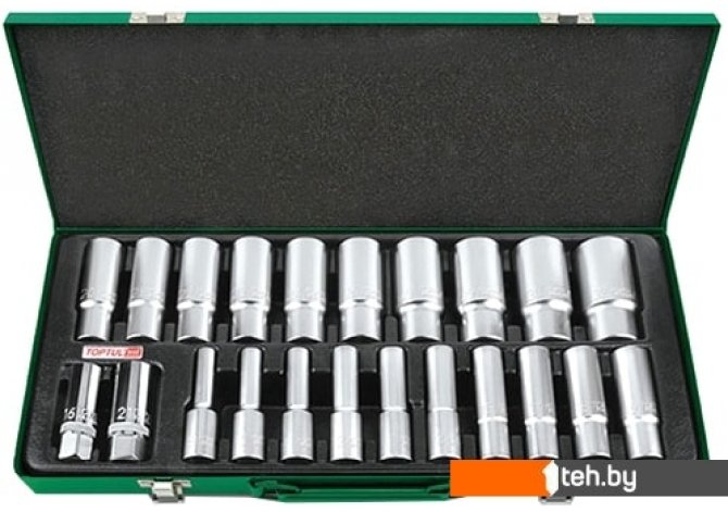 | Комплектация | - Глубокие торцевые головки: 8, 10, 11, 12, 13, 14, 15, 17, 18, 19, 20, 21, 22, 23, 24, 26, 27, 29, 30, 32 мм.- Головки свечные 16, 21 мм. |