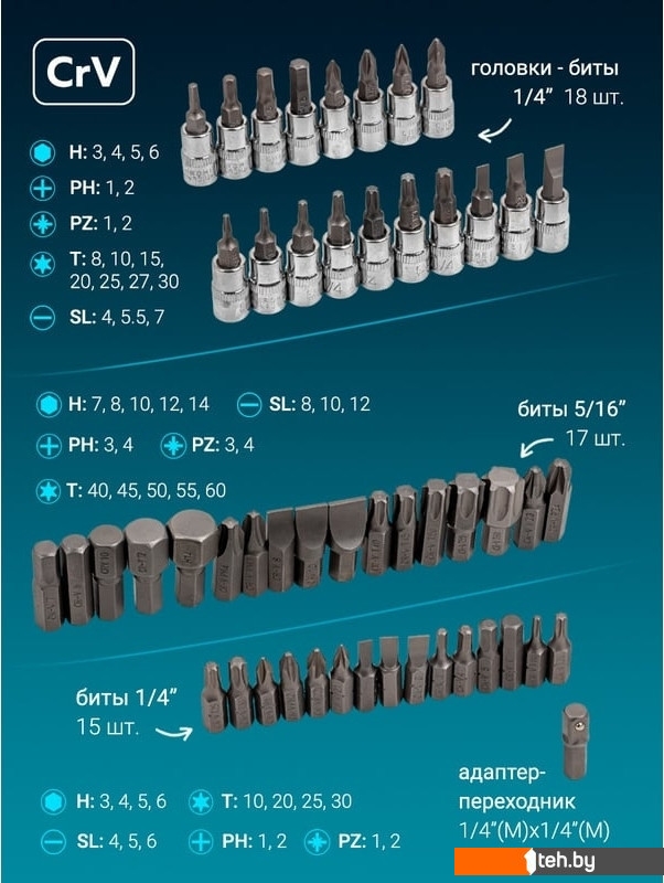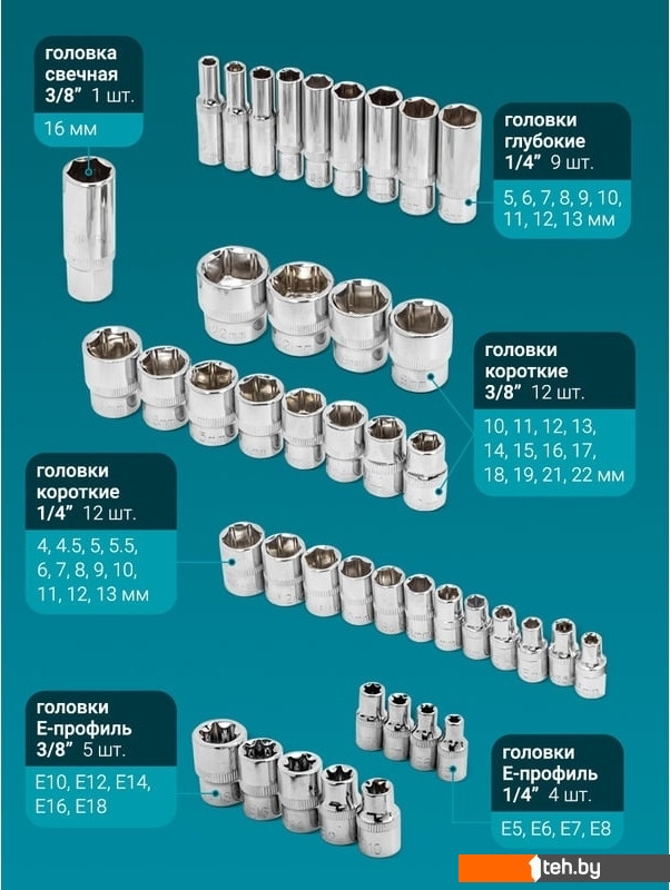 Комплектация | Головки 1/4" короткие 12 шт.: 4, 4.5, 5, 5.5, 6, 7, 8, 9, 10, 11, 12, 13 мм. Головки 1/4" глубокие 9 шт.: 5, 6, 7, 8, 9, 10, 11, 12, 13 мм. Головки 1/4" Е-профиль 4 шт.: Е5, Е6, Е7, Е8 Головки 3/8" короткие 12 шт.: 10, 11, 12, 13, 14, 15, 16, 17, 18, 19, 21, 22 мм. Головки 3/8" Е-профиль 5 шт.: Е10, Е12, Е14, Е16, Е18 Головка свечная 3/8": 16 мм. Головки-биты 1/4" 18 шт.: H: 3, 4, 5, 6 мм T: 8, 10, 15, 20, 25, 27, 30 мм SL: 4, 5.5, 7 мм PH: 1, 2 мм PZ: 1, 2 мм Биты 5/16" 17 шт.: H: 7, 8, 10, 12, 14 мм T: 40, 45, 50, 55, 60 мм SL: 8, 10, 12 мм PH: 3, 4 мм PZ: 3, 4 мм Бита 1/4" 15 шт.: H: 3, 4, 5, 6 мм T: 10, 20, 25, 30 мм SL: 4, 5, 6 мм PH: 1, 2 мм PZ: 1, 2 мм 6-гр Г-образные короткие: 1.5, 2, 2.5 мм. Трещотки 1/4" и 3/8", Удлинитель 3/8", Удлинители 1/4" 50 и 100 мм., Вороток Т-образный, Битодержатели 1/4" и 3/8", Кардан 1/4" и 3/8", Рукоятка, Адаптер 1/4", Кейс. |