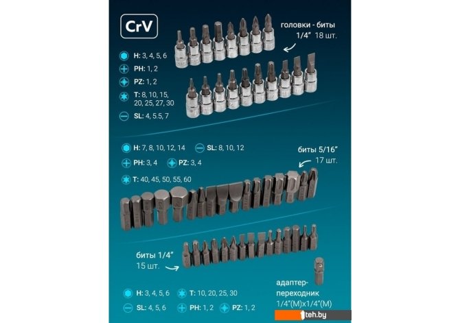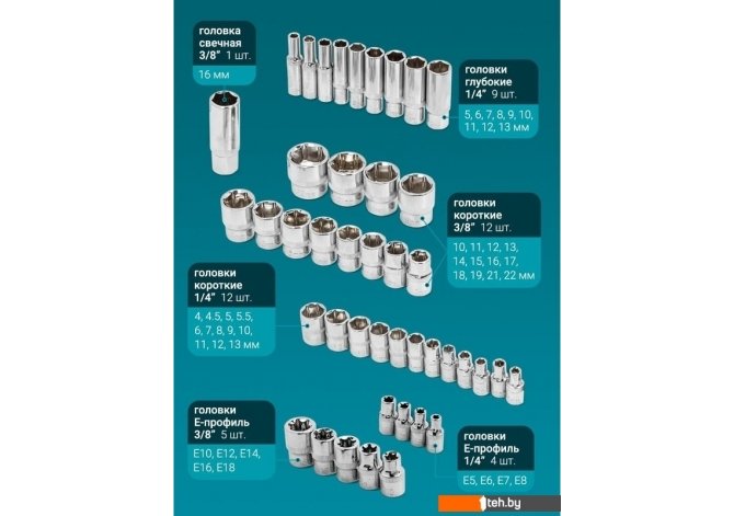 | Комплектация | Головки 1/4" короткие 12 шт.: 4, 4.5, 5, 5.5, 6, 7, 8, 9, 10, 11, 12, 13 мм. Головки 1/4" глубокие 9 шт.: 5, 6, 7, 8, 9, 10, 11, 12, 13 мм. Головки 1/4" Е-профиль 4 шт.: Е5, Е6, Е7, Е8 Головки 3/8" короткие 12 шт.: 10, 11, 12, 13, 14, 15, 16, 17, 18, 19, 21, 22 мм. Головки 3/8" Е-профиль 5 шт.: Е10, Е12, Е14, Е16, Е18 Головка свечная 3/8": 16 мм. Головки-биты 1/4" 18 шт.: H: 3, 4, 5, 6 мм T: 8, 10, 15, 20, 25, 27, 30 мм SL: 4, 5.5, 7 мм PH: 1, 2 мм PZ: 1, 2 мм Биты 5/16" 17 шт.: H: 7, 8, 10, 12, 14 мм T: 40, 45, 50, 55, 60 мм SL: 8, 10, 12 мм PH: 3, 4 мм PZ: 3, 4 мм Бита 1/4" 15 шт.: H: 3, 4, 5, 6 мм T: 10, 20, 25, 30 мм SL: 4, 5, 6 мм PH: 1, 2 мм PZ: 1, 2 мм 6-гр Г-образные короткие: 1.5, 2, 2.5 мм. Трещотки 1/4" и 3/8", Удлинитель 3/8", Удлинители 1/4" 50 и 100 мм., Вороток Т-образный, Битодержатели 1/4" и 3/8", Кардан 1/4" и 3/8", Рукоятка, Адаптер 1/4", Кейс. |