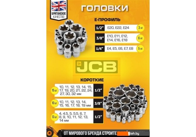 | Информация | - Набор инструментов от бренда JCB из 216 предметов в кейсе - красивый и функциональный комплект инструментов, который обязательно порадует любого автолюбителя. - В наборе есть широкий выбор головок, бит и ключей различных размеров, что позволяет использовать его для ремонта многих моделей машин. - В комплект входит дорожный чемодан, который легко поместится в багажник вашего авто. - Кроме того, этот набор инструментов идеально подходит для использования дома. |