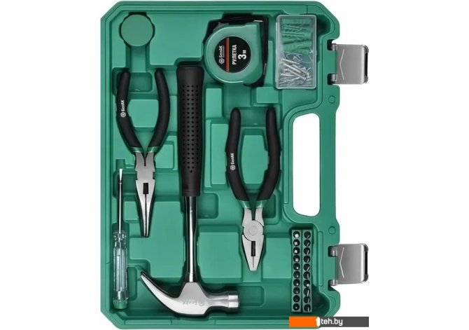 | Комплектация | Прочный материал и хорошая термическая обработка гарантируют долговечность и высокую износостойкость инструментов Удобный кейс с надежными замками облегчает транспортировку и защищает инструменты от потерь Набор включает ряд других ручных инструментов, пригодных для бытовых и профессиональных задач Отсутствие трещоток, торцевых головок и рожковых ключей делает данный набор специализированным и более узконаправленным по применению. |