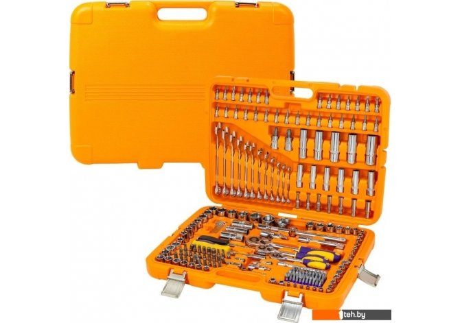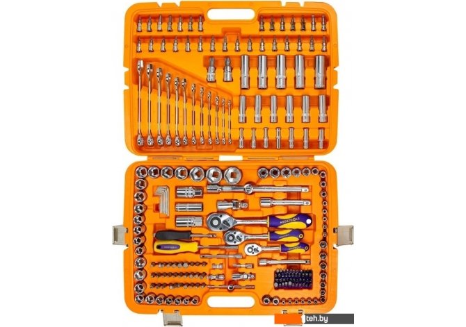 Комплектация | - головки торцевые: 1/2? (13, 14, 15, 16, 17, 18, 19, 20, 21, 22, 24, 27, 30, 32 мм), 3/8? (10, 11, 12, 13, 14, 15, 16, 17, 18, 19 мм) - головки торцевые глубокие: 1/2? (16, 17, 18, 19, 22 мм), 3/8? (10, 11, 12, 13, 14, 15 мм) - торцевые головки E-тип: 1/2? (Е20, Е22, Е24), 3/8? (Е10, Е11, Е12, Е14, Е16, Е18 ), 1/4? (Е4, Е5, Е6, Е7, Е8) - головки со вставкой: шлицевые (SL) (SL4, SL4.5, SL6.5, SL7), крестовые (PH) (РН0, РН1, РН2), крестовые с насечками (PZ) (PZ0, PZ1, PZ2), шестигранные (Hex) (Н3, Н4, Н5, Н6), звездочкой (Torx) (Т8, Т9, Т10, Т15, Т20, Т25, Т27, Т30), звездочкой с отверстием (Torx) (ТТ8, ТТ9, ТТ10, ТТ15, ТТ20, ТТ25, ТТ27, ТТ30) - насадки-биты: шлицевые (SL) (SL4, SL5.5, SL6, SL6.5, SL7, SL8), крестовые (PH) (РН0, РН1, РН2, РН3, РН4), крестовые с насечками (PZ) (РZ0, РZ1, РZ2, РZ3, РZ4), шестигранные (Hex) (Н2, Н2.5, Н3, Н4, Н5, Н5.5, Н6, Н6.5, Н7, Н8, Н10, Н12), звездочкой (Torx) (Т27, Т30, Т35, Т40, Т45, Т50), звездочкой с отверстием (Torx) (Т8, Т10, Т15, Т20, Т25, Т27, Т30, Т40, Т45), 12-гранные Spline (М5, М6, М8, М10, М12), 3-лучевая Tri-Wing (TW) (TW1, TW2, TW3, TW4) - удлинители: 1/2? (125, 250 мм), 3/8? (125 мм), 1/4? (50, 100 мм) - кардан: 1/2?, 3/8?, 1/4? - трещотка: 1/2?, 3/8?, 1/4? - отвертка под биты - ключ комбинированный 12 шт - вороток - ключ угловой шестигранный 7 шт |