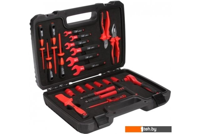 | Комплектация | - диэлектр. трещоточный ключ 200 мм- диэлектр. Т-образная рукоятка 200 мм- диэлектр. удлинитель 150 мм- диэлектр. шестигранная головка 3/8’’ – 8 мм- диэлектр. шестигранная головка 3/8’’ – 10 мм- диэлектр. шестигранная головка 3/8’’ – 12 мм- диэлектр. шестигранная головка 3/8’’ – 13 мм- диэлектр. шестигранная головка 3/8’’ – 17 мм- диэлектр. шестигранная головка 3/8’’ – 19 мм- диэлектр. однорожковый ключ 8 мм- диэлектр. однорожковый ключ 10 мм- диэлектр. однорожковый ключ 12 мм- диэлектр. однорожковый ключ 13 мм- диэлектр. однорожковый ключ 17 мм- диэлектр. однорожковый ключ 19 мм- диэлектр. нож монтерский НМИ-05- диэлектр. пассатижи 180 мм- диэлектр. бокорезы 160 мм- диэлектр. отвертка: шлиц 4х100- диэлектр. отвертка: шлиц 5.5х125- диэлектр. отвертка: PH1x80- диэлектр. отвертка: PH2x100- отвертка-индикатор |
