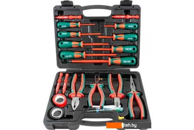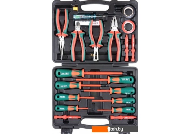 | Комплектация | Инструменты в наборе отвертка (9 шт.), пассатижи (1 шт.), длинногубцы (1 шт.), бокорезы (1 шт.), щипцы (для зачистки - 1 шт.) Отвертки шлицевая (SL) (5 шт.), крестовая (PH) (3 шт.), индикаторная (1 шт.) Доп. комплектация изолента (2 шт.), кейс (пластиковый), стержни (отверточные диэлектрические с нестандартными рабочими профилями ), втулка |