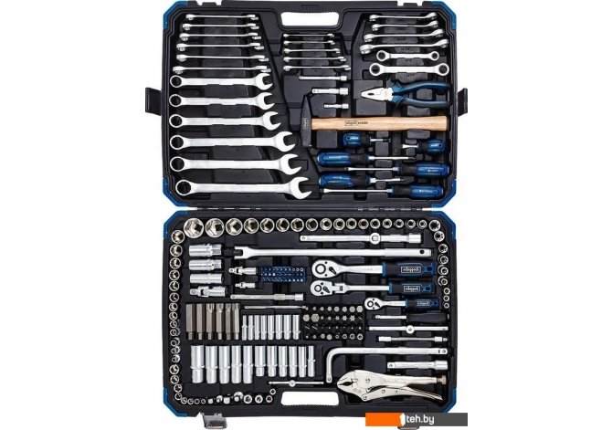 | Комплектация | головки, биты, трещотки, удлинители, ключи, отвертки, плоскогубцы, молоток, кейс |